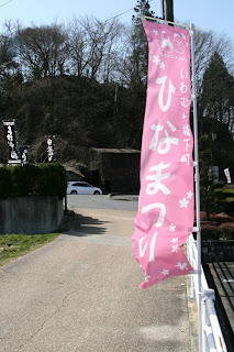 A flag announcing Hinamatsuri and the displays in historic Iwamura shitamachi.